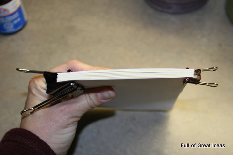 Stack the pages so they line up perfectly on the top. I put one piece of card stock on the top and bottom and then (IMPORTANT) one blank page on the top and bottom. The blank page will be removed at the end but this allows you to get a good amount of glue on the seam without worrying about getting it on the cover. Clamp on both sides of the pad with butterfly clips.